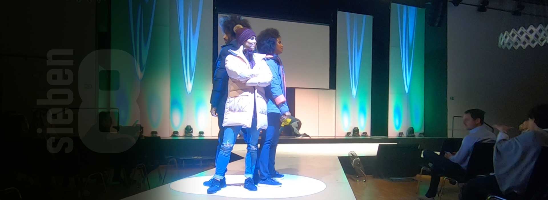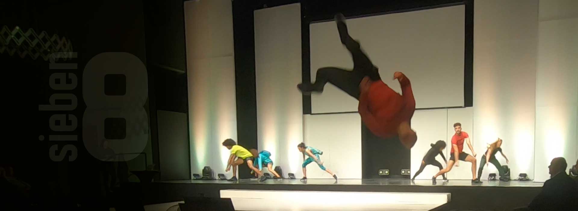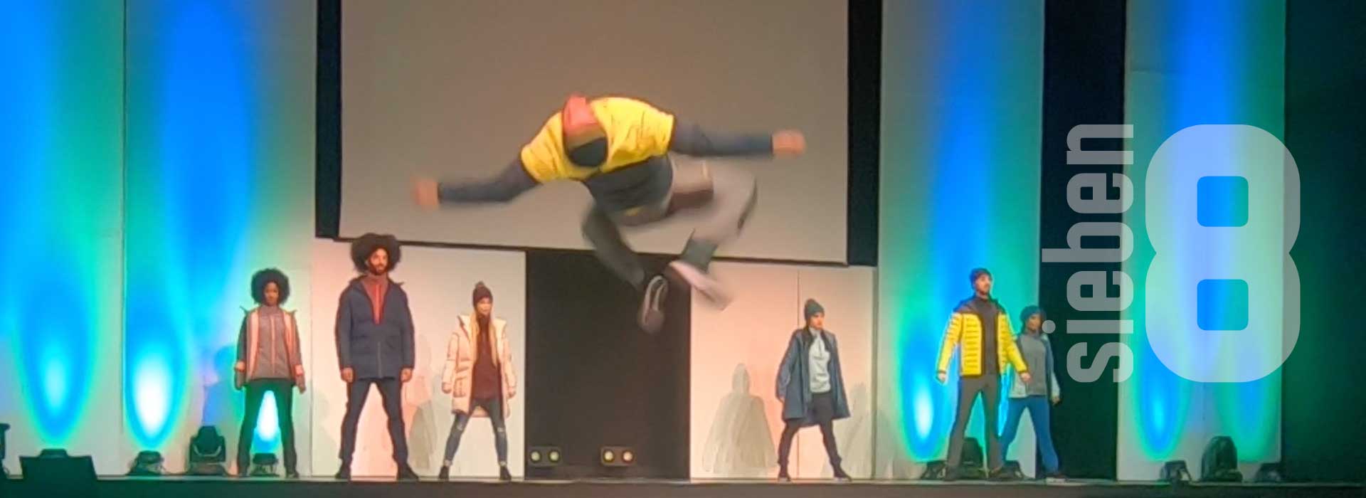 Was dieses sieben8 Messe-Event von Anfang an so besonders macht? Es startet mit einem AC/DC Song, zu dem die Tänzer und Artisten das Publikum in den Veranstaltungssaal ziehen. Auch das Bühnen-Set-up ist außergewöhnlich, denn die Zuschauer sitzen mittendrin statt nur davor. Durch Trampoline zwischen Bühne und Catwalk überraschen die Künstler während der Show mit hohen Sprüngen und artistischen Effekten. Und auch die passend zu den Warengruppen gewählten coolen Beats und der punktgenaue Einsatz von Licht und Bühnentechnik machen dieses Event zu reinem Rock’n’Roll.